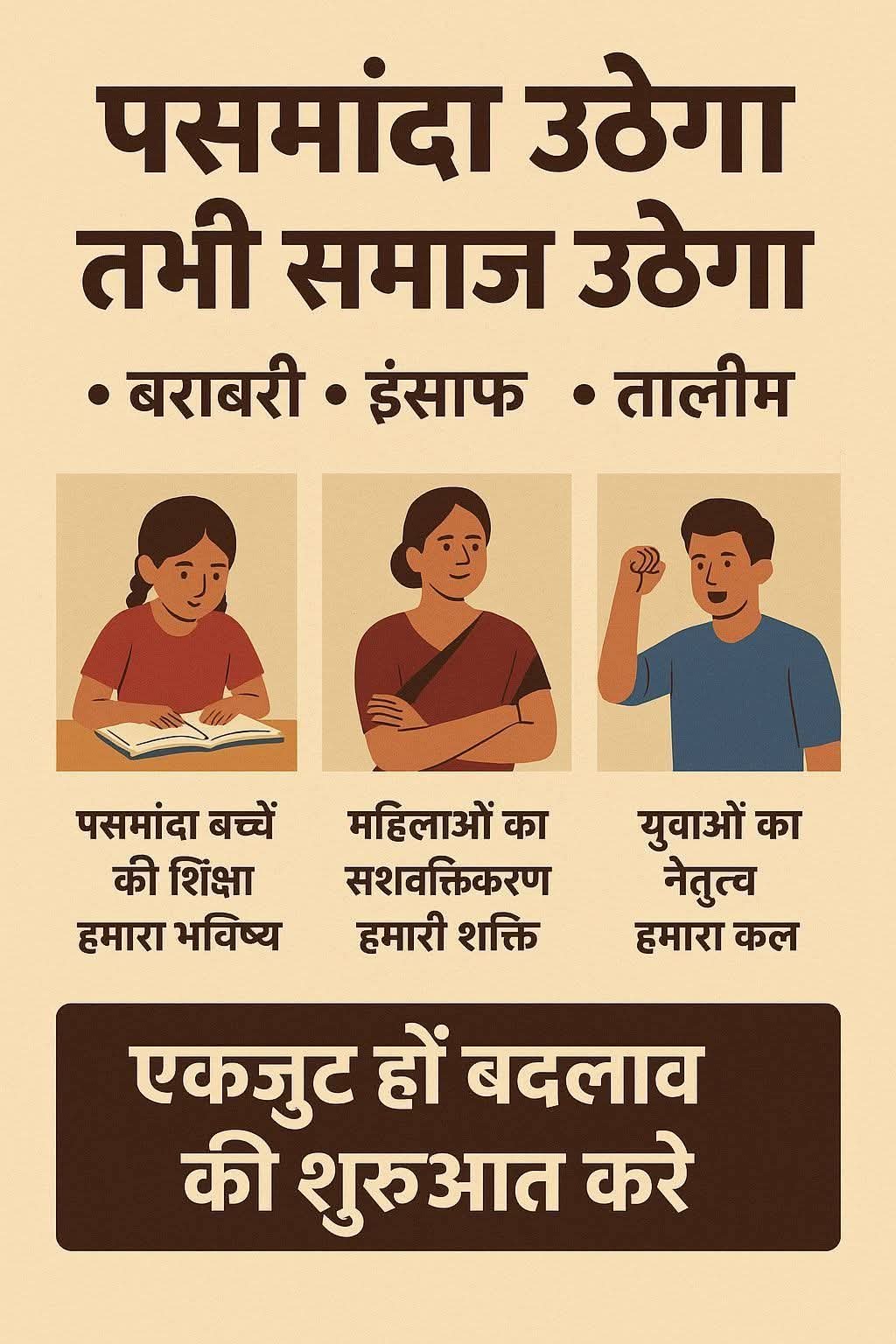 1. सामाजिक समानता — पसमांदा मुस्लिम समाज (जो लगभग 85% मुसलमानों का हिस्सा है) के अंदर जाति-आधारित भेदभाव को मिटाना और समानता स्थापित करना।