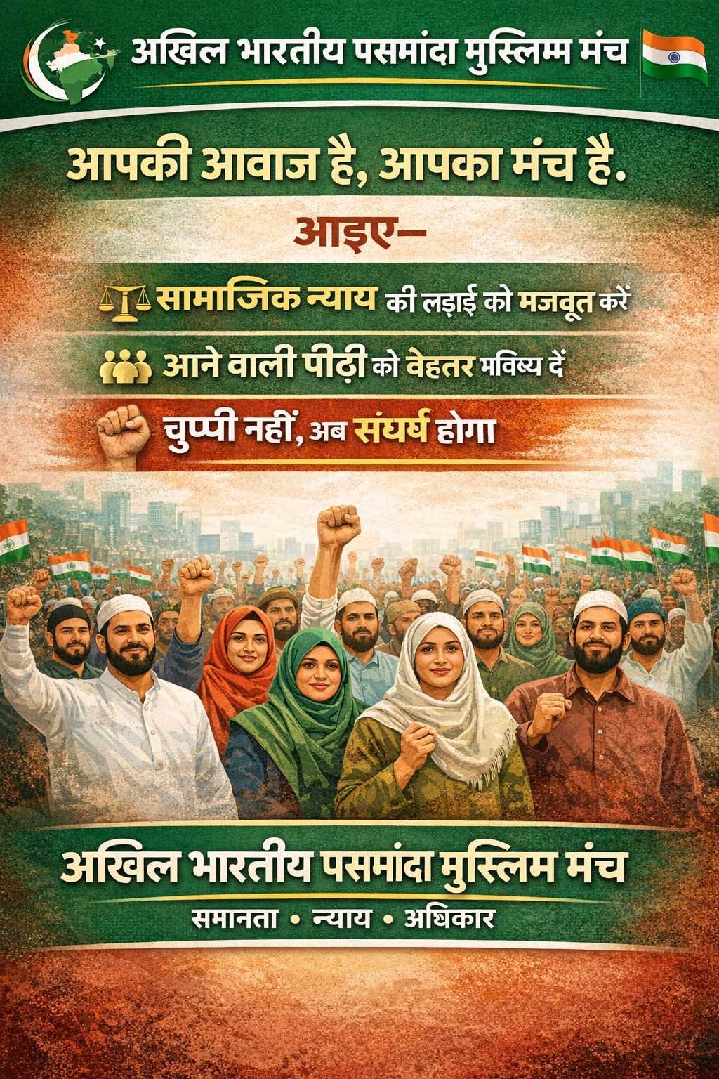 5. नागरिक अधिकार — पसमांदा मुसलमानों के नागरिक अधिकारों की सुरक्षा, सरकारी योजनाओं तक पहुंच, और उनका संवैधानिक उत्थान सुनिश्चित करना।